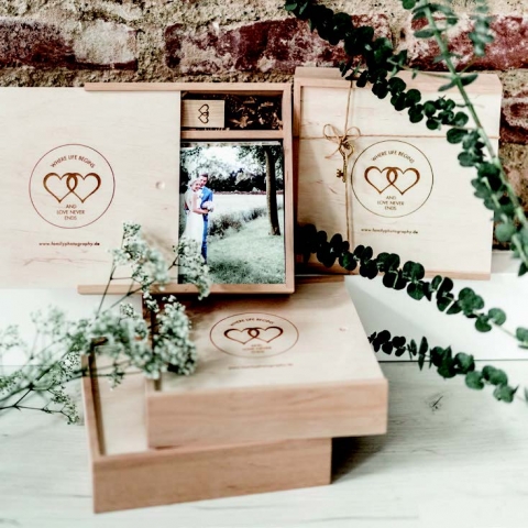Zudem bekommt Ihr die Bilder hochauflösend auf einem edlen USB Stick, welcher sich in einer wunderschön gestaltete Fotobox befindet. In der Box befinden sich ebenfalls hochwertig gedruckte Fine Art Fotos in 13x18 - ein kleines Geschenk an Euch!